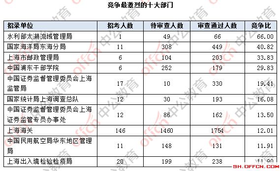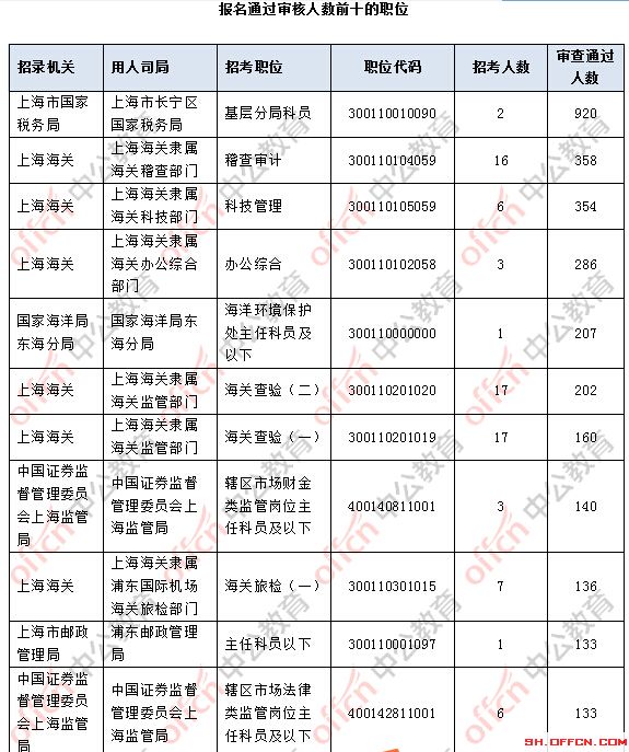 為幫助廣大考生更清晰的了解今日報(bào)名情況,上海中公教育整理了審核通過人數(shù)前十位的部門以及競爭比例最激烈的十大部門,供廣大考生參考: