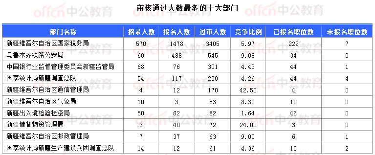 為幫助廣大考生更清晰的了解今日報名情況,中公教育整理了審核通過人數(shù)前十位的部門以及競爭比例最激烈的十大部門,供廣大考生參考: