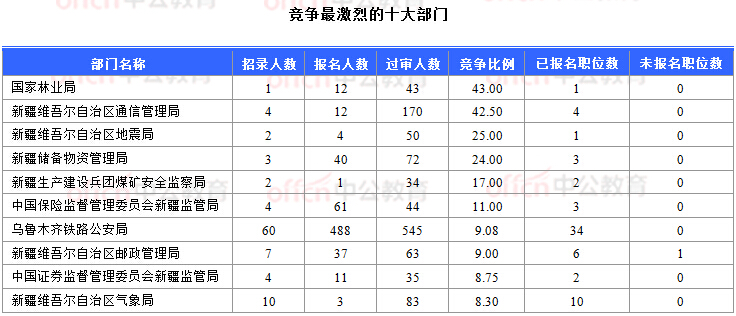 報名通過審核人數(shù)前十的職位主要集中在烏魯木齊鐵路公安局、新疆維吾爾自治區(qū)國家稅務(wù)局、新疆維吾爾自治區(qū)通信管理局、新疆維吾爾自治區(qū)郵政管理局,具體信息如下: