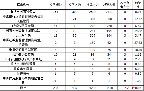 截止到2日16時,通過審核人數(shù)前三位的部門依次是:重慶省國家稅務(wù)局、中國銀行業(yè)監(jiān)督管理委員會重慶監(jiān)管局、成都鐵路公安局三部門通過審核總?cè)藬?shù)達2999人,占通過審核總?cè)藬?shù)的85%。競爭比的部門是中國證券監(jiān)督管理委員會重慶監(jiān)管局,達到27:1。
