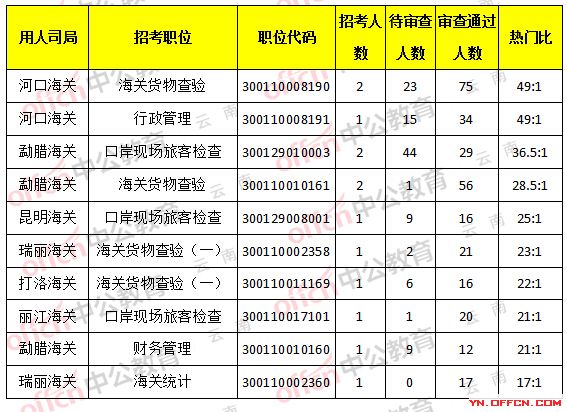 當前河口海關(guān)海關(guān)貨物查驗,職位代碼300110008190的崗位相比報名人數(shù)為多,招2人,23人報名待審,75人過審,熱門比為:49:1