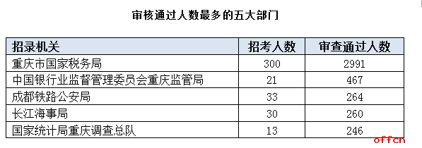 截止到3日16時(shí),通過(guò)審核人數(shù)前三位的部門依次是:重慶市國(guó)家稅務(wù)局、中國(guó)銀行業(yè)監(jiān)督管理委員會(huì)重慶監(jiān)管局、成都鐵路公安局,三部門通過(guò)審核總?cè)藬?shù)達(dá)3722人,占通過(guò)審核總?cè)藬?shù)的81%。