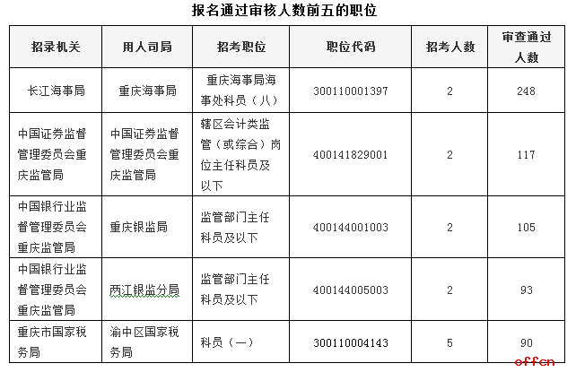 報名通過審核人數(shù)前五的職位主要集中在中國銀行業(yè)監(jiān)督管理委員會重慶監(jiān)管局、長江海事局、重慶市國家稅務(wù)局等部門,具體信息如下: