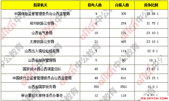 為幫助廣大考生更清晰的了解今日報名情況,山西中公網(wǎng)校整理了審核通過人數(shù)前十位的部門以及競爭比例最激烈的十大部門,供廣大考生參考: