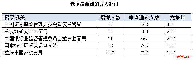 為幫助廣大考生更清晰的了解今日?qǐng)?bào)名情況,中公網(wǎng)校整理了審核通過人數(shù)前五的部門以及競爭比例最激烈的五大部門,供廣大考生參考: