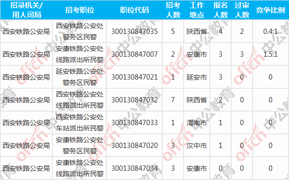 截至到3日16時(shí),陜西國(guó)考鐵路公安系統(tǒng)共有7個(gè)職位報(bào)考不足5人,占鐵路公安系統(tǒng)全部職位的22.6%。下面是陜西國(guó)考鐵路公安系統(tǒng)冷門職位一覽表,陜西中公網(wǎng)校專家建議廣大考生多關(guān)注一些較冷職位,避免激烈競(jìng)爭(zhēng),結(jié)合自身?xiàng)l件,找到屬于自己的職位。