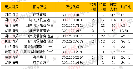 當(dāng)前河口海關(guān)行政管理,職位代碼300110008191的崗位相比報(bào)名人數(shù)為多,招1人,17人報(bào)名待審,47人過審,熱門比為:64:1