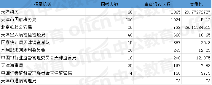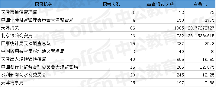 為幫助廣大考生更清晰的了解今日報名情況,中公網(wǎng)校整理了審核通過人數(shù)前十位的部門以及競爭比例最激烈的十大部門,供廣大考生參考: