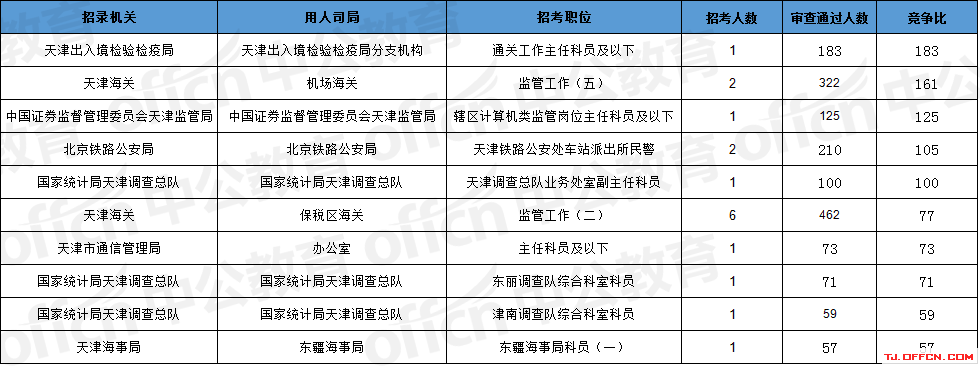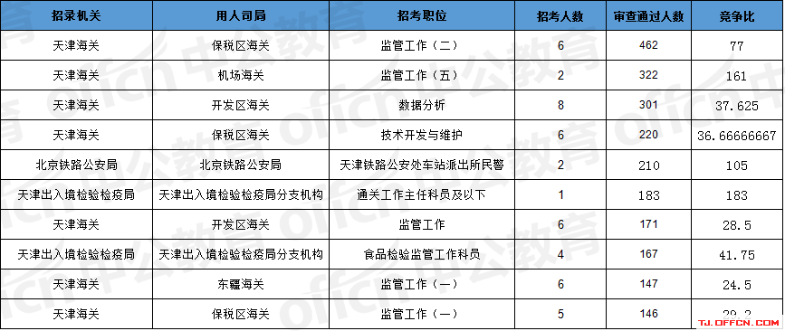 報名通過審核人數(shù)前十的職位主要集中在天津海關(guān)、北京鐵路公安局、天津出入境檢驗檢疫局等部門,具體信息如下: