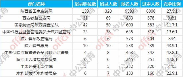 陜西國考報名競爭最激烈的十大部門