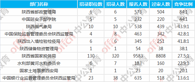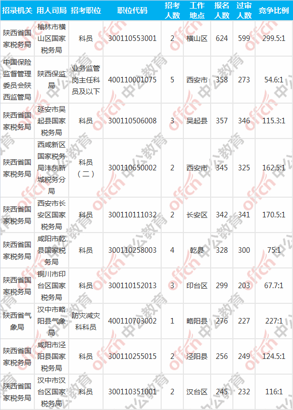 報(bào)名人數(shù)前十的職位主要集中在陜西省國(guó)家稅務(wù)局、中國(guó)保險(xiǎn)監(jiān)督管理委員會(huì)陜西監(jiān)管局、陜西省氣象局等部門(mén),具體信息如下: