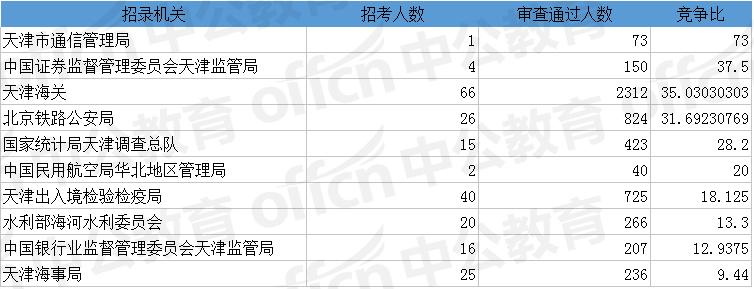 為幫助廣大考生更清晰的了解今日?qǐng)?bào)名情況,中公網(wǎng)校整理了審核通過(guò)人數(shù)前十位的部門(mén)以及競(jìng)爭(zhēng)比例最激烈的十大部門(mén),供廣大考生參考: