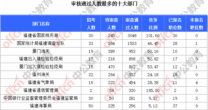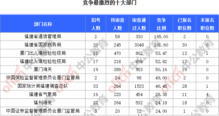 為幫助廣大考生更清晰的了解今日報名情況,福建中公教育專家整理了審核通過人數(shù)前十位的部門以及競爭比例最激烈的十大部門,供廣大考生參考: