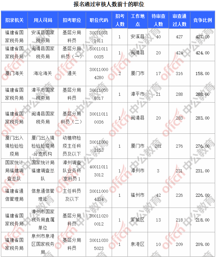 報名通過審核人數(shù)前十的職位主要集中在福建省國家稅務(wù)局、廈門海關(guān)、廈門出入境檢驗檢疫局等部門,具體信息如下: