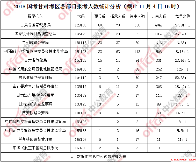 [11月4日16時(shí)]甘肅2018國考報(bào)名人數(shù)統(tǒng)計(jì):過審7565人 最熱競爭比例489:1