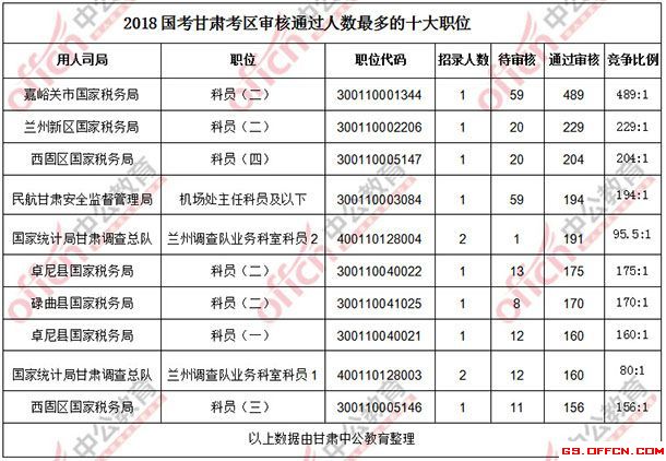 報(bào)名通過審核人數(shù)前十的職位主要集中在嘉峪關(guān)市國家稅務(wù)局、蘭州新區(qū)國家稅務(wù)局、西固區(qū)國家稅務(wù)局等部門,具體信息如下: