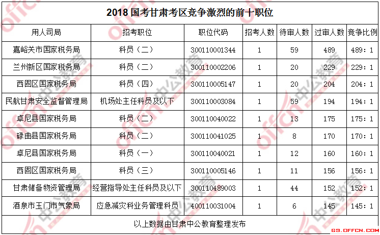 11月4日16時(shí),競爭比例的職位為甘肅省國家稅務(wù)局嘉峪關(guān)市國家稅務(wù)局科員(二)一職,招錄1人,11月4日16時(shí)通過人數(shù)為489人,競爭比例為489:1!