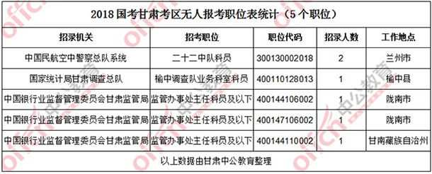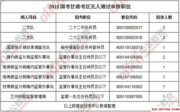 11月4日16時,工作地點(diǎn)在甘肅的職位共有8個職位無人通過審核,占全部職位的3.7%,5個職位無人報考,占全部職位的2.3%。下面是無人待審及無人報報職位一覽表,中公網(wǎng)校專家建議廣大考生多關(guān)注一些較冷職位,避免激烈競爭,結(jié)合自身?xiàng)l件,找到屬于自己的職位。