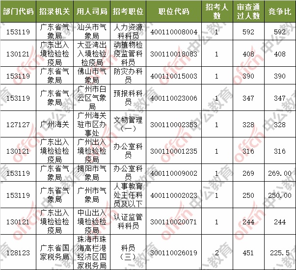 報名通過審核人數前十的職位主要集中在深圳海關、廣東省氣象局、廣東省國家稅務局等部門,具體信息如下: