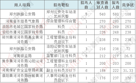 報(bào)名通過審核人數(shù)前十的職位主要集中在鄭州鐵路公安局、河南省氣象局、河南省國(guó)家稅務(wù)局,具體信息如下: