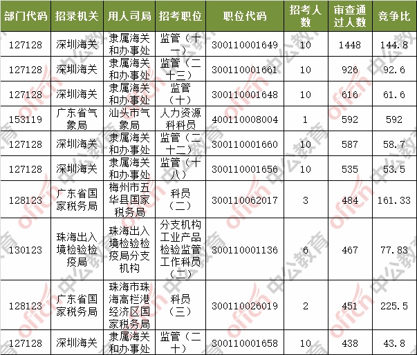 報(bào)名通過審核人數(shù)前十的職位主要集中在深圳海關(guān)、廣東省氣象局、廣東省國家稅務(wù)局等部門,具體信息如下: