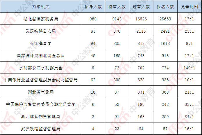 截止到11月4日16時,報名人數(shù)排名前三位的部門依次是:湖北省國家稅務(wù)局、武漢鐵路公安局、長江海事局,三部門通過審核總?cè)藬?shù)達19454人,占通過審核總?cè)藬?shù)的86.4%。