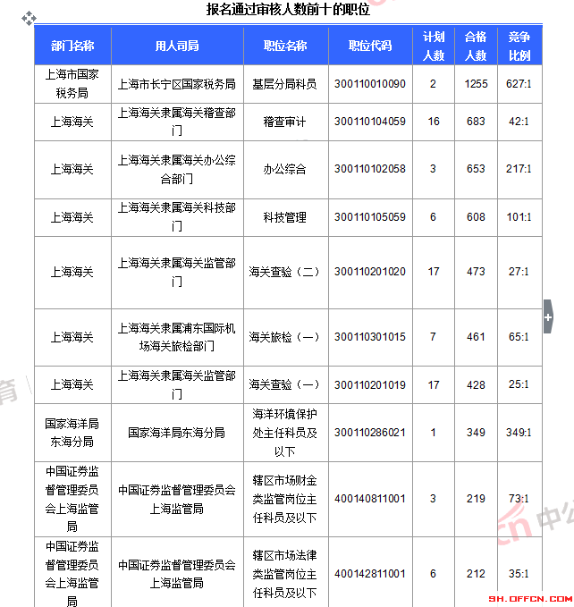 報(bào)名通過(guò)審核人數(shù)前十的職位主要集中在上海市國(guó)家稅務(wù)局、上海海關(guān)、國(guó)家海洋局東海分局等部門,具體信息如下: