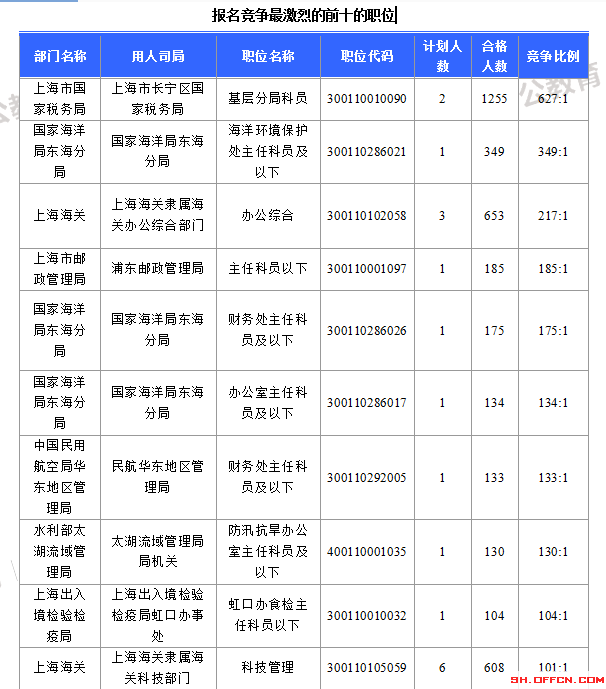 報名競爭最激烈的前十的職位