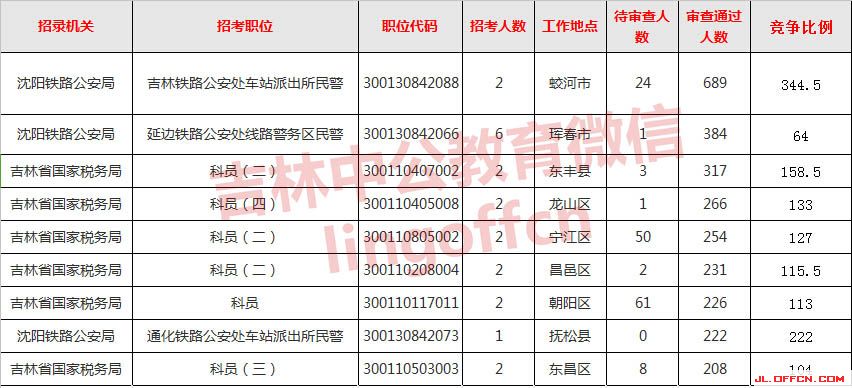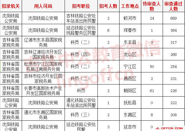 報(bào)名通過(guò)審核人數(shù)前十的職位主要集中在沈陽(yáng)鐵路公安局、吉林國(guó)家稅務(wù)局、吉林出入境檢疫檢驗(yàn)局等部門,具體信息如下: