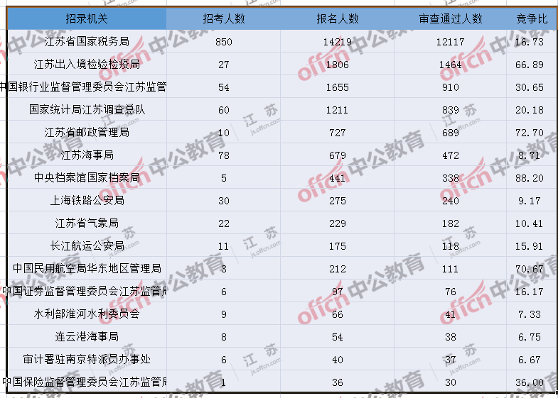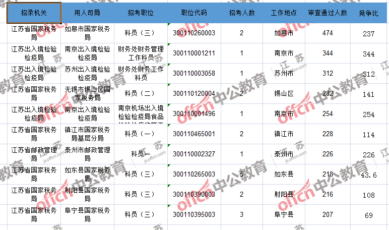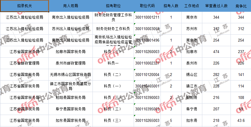 報(bào)名通過審核人數(shù)前十的職位主要集中在江蘇出入境檢驗(yàn)檢疫局、江蘇省郵政管理局、江蘇省國家稅務(wù)局等部門,具體信息如下: