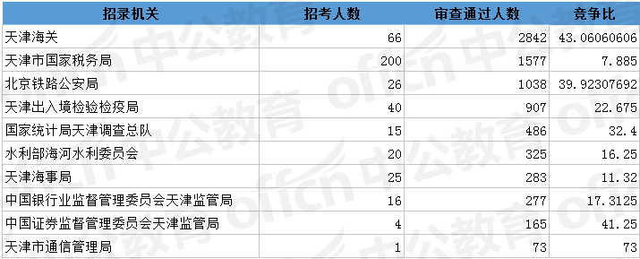 為幫助廣大考生更清晰的了解今日?qǐng)?bào)名情況,中公網(wǎng)校整理了審核通過人數(shù)前十位的部門以及競爭比例最激烈的十大部門,供廣大考生參考: