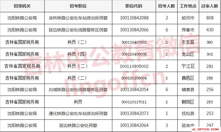 報名通過審核人數(shù)前十的職位主要集中在沈陽鐵路公安局、吉林國家稅務(wù)局等部門,具體信息如下: