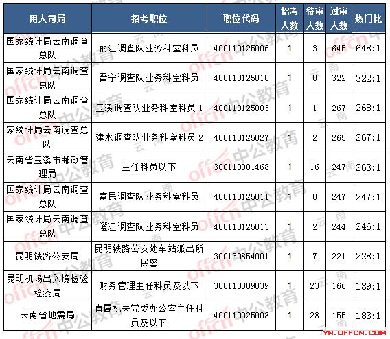 當(dāng)前最受歡迎的崗位是國家統(tǒng)計局云南調(diào)查總隊,麗江調(diào)查隊業(yè)務(wù)科室科員,職位代碼:400110125006,招錄1人,648人報名,其中3人待審核通過,詳情如下圖: