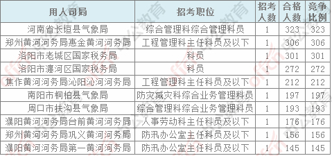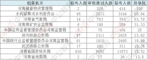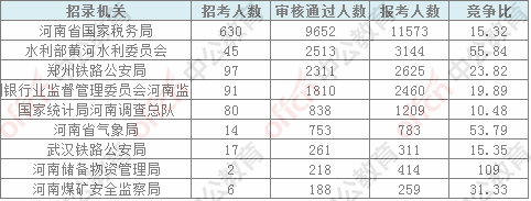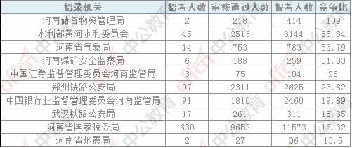 報名通過審核人數(shù)前十的職位主要集中在鄭州鐵路公安局、河南省氣象局、河南省國家稅務局,具體信息如下: