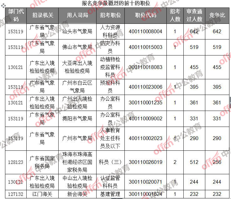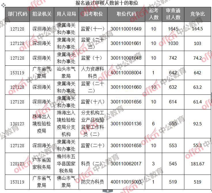 報名通過審核人數(shù)前十的職位主要集中在深圳海關(guān)、廣東省氣象局、廣東省國家稅務(wù)局等部門,具體信息如下: