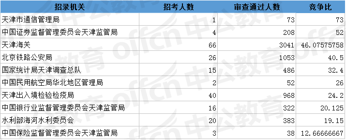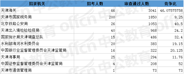 為幫助廣大考生更清晰的了解今日報(bào)名情況,中公網(wǎng)校整理了審核通過人數(shù)前十位的部門以及競爭比例最激烈的十大部門,供廣大考生參考: