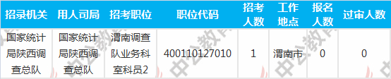 截至到6日9時(shí),工作地點(diǎn)在陜西的職位僅有1個(gè)無人報(bào)考。下面是無人報(bào)考職位一覽表,中公網(wǎng)校專家建議廣大考生多關(guān)注一些較冷職位,避免激烈競爭,結(jié)合自身?xiàng)l件,找到屬于自己的職位。