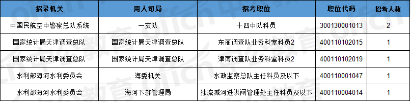 截止到6日16時(shí),工作地點(diǎn)在天津的職位共有5個(gè)無(wú)人報(bào)考,占全部職位的2.4%。下圖是無(wú)人報(bào)考職位一覽表,中公網(wǎng)校專家建議廣大考生多關(guān)注一些較冷職位,避免激烈競(jìng)爭(zhēng),結(jié)合自身?xiàng)l件,找到屬于自己的職位。
