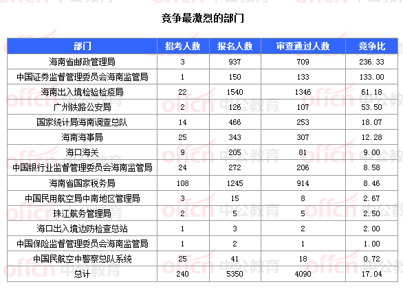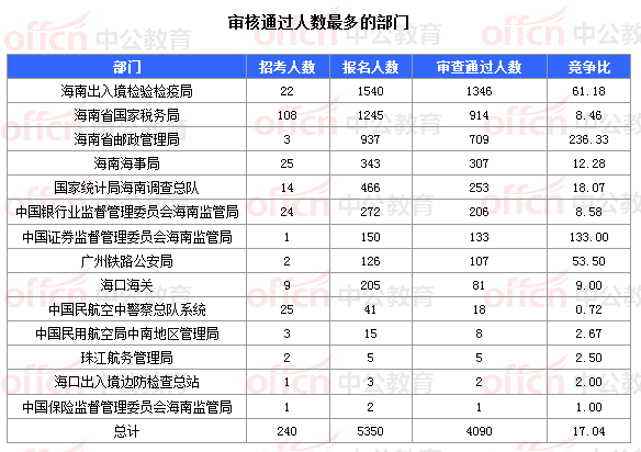截止到6日16時(shí),通過審核人數(shù)前三位的部門依次是:海南出入境檢驗(yàn)檢疫局、海南省郵政管理局、海南省國家稅務(wù)局,三部門通過審核總?cè)藬?shù)達(dá)2969人,占通過審核總?cè)藬?shù)的72.59%。
