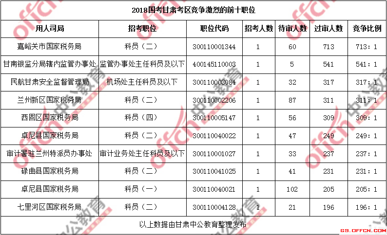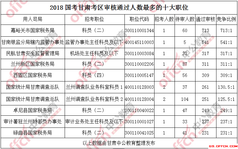 報(bào)名通過審核人數(shù)前十的職位主要集中在嘉峪關(guān)市國(guó)家稅務(wù)局、甘南銀監(jiān)分局轄內(nèi)監(jiān)管辦事處、民航甘肅安全監(jiān)督管理局部門,具體信息如下: