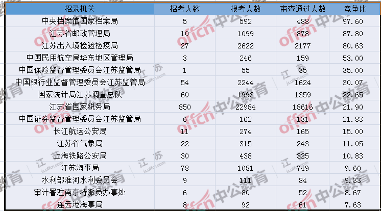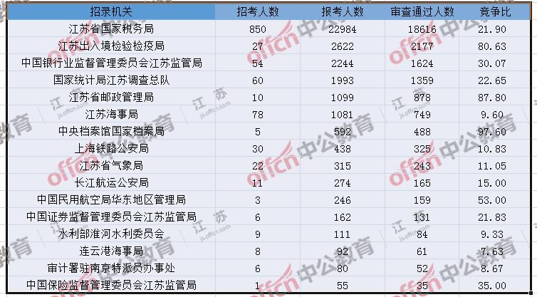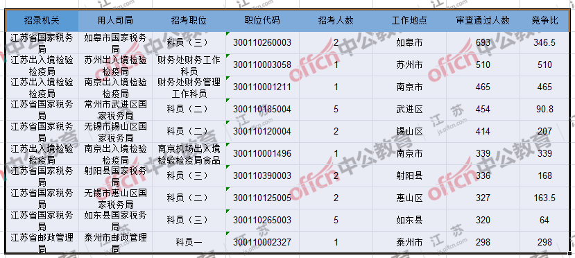 報(bào)名通過審核人數(shù)前十的職位主要集中在江蘇出入境檢驗(yàn)檢疫局、江蘇省郵政管理局、江蘇省國(guó)家稅務(wù)局等部門,具體信息如下: