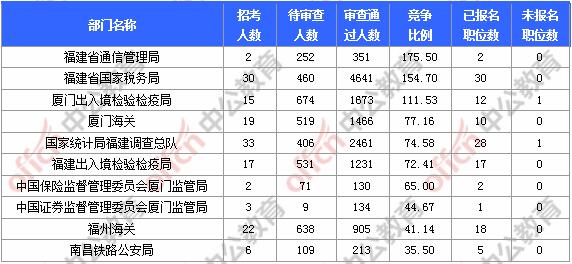 截至11月6日16時(shí),據(jù)中公網(wǎng)校統(tǒng)計(jì),國考職位中工作地點(diǎn)在福建的職位4785人待審 ,14773人通過審核,共報(bào)名19558人,其中有8個(gè)職位無人報(bào)名,平均競(jìng)爭(zhēng)比例為61.98:1。