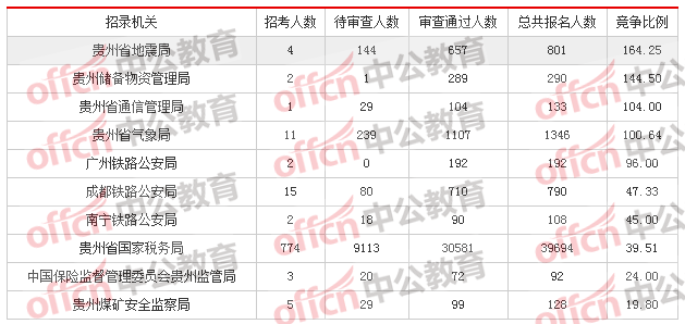 截止到5日16時(shí),報(bào)名人數(shù)及通過審核人數(shù)前三位的部門依次是:貴州省國(guó)家稅務(wù)局、貴州省氣象局、中國(guó)銀行業(yè)監(jiān)督管理委員會(huì)貴州監(jiān)管局,三部門報(bào)名人數(shù)達(dá)到41847人,占總報(bào)名人數(shù)的92.69%,通過審核總?cè)藬?shù)達(dá)32288人,占通過審核總?cè)藬?shù)的92.68%。