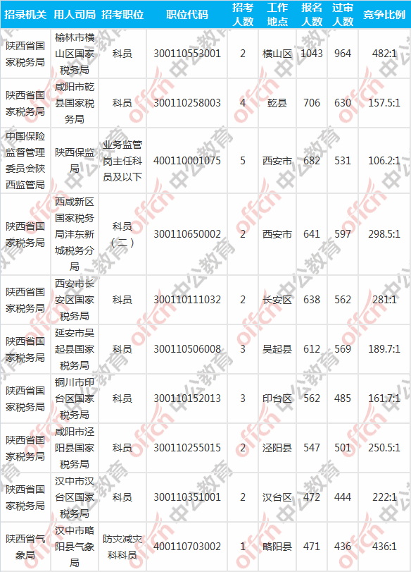 陜西國考報名競爭最激烈的十大部門