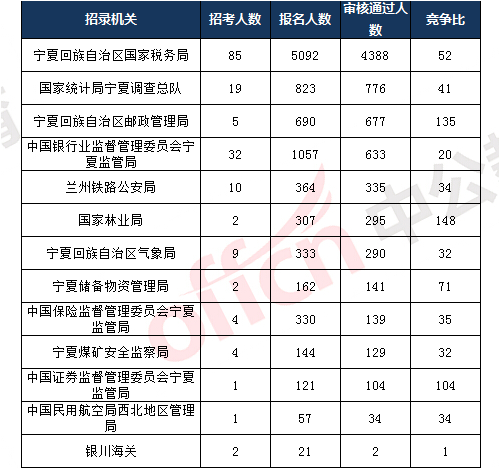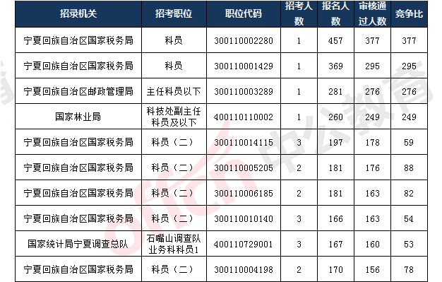 截止到11月7日16時,報名通過審核人數(shù)前十的職位主要為寧夏回族自治區(qū)國家稅務(wù)局、寧夏回族自治區(qū)郵政管理局,具體信息如下: