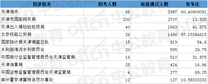 為幫助廣大考生更清晰的了解今日?qǐng)?bào)名情況,中公網(wǎng)校整理了審核通過(guò)人數(shù)前十位的部門(mén)以及競(jìng)爭(zhēng)比例最激烈的十大部門(mén),供廣大考生參考:
