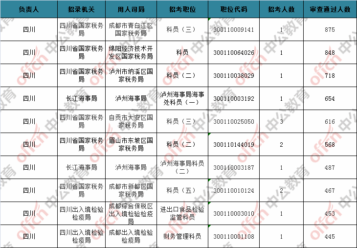 第五日報名通過審核人數(shù)前十的職位主要集四川省國家稅務(wù)局等部門,具體信息如下:
