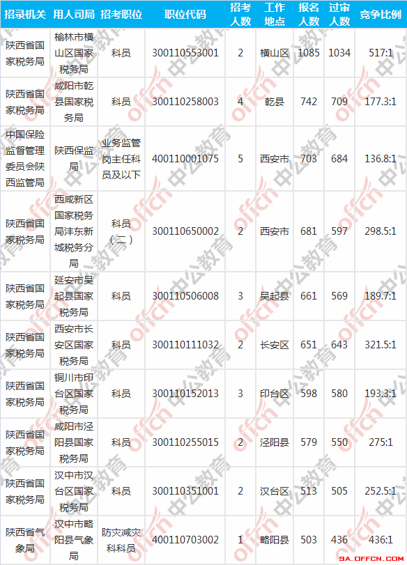 報(bào)名人數(shù)前十的職位主要集中在陜西省國(guó)家稅務(wù)局、中國(guó)保險(xiǎn)監(jiān)督管理委員會(huì)陜西監(jiān)管局、陜西省氣象局等部門(mén),具體信息如下: