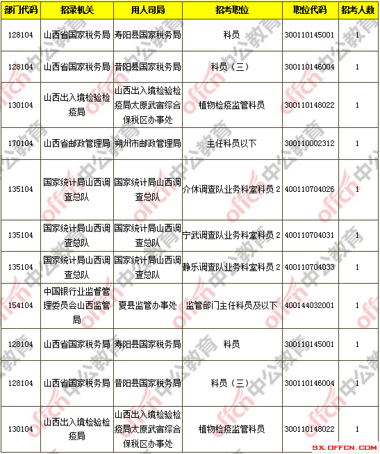 截止到11月7日16時(shí),工作地點(diǎn)在山西的職位共有8個(gè)無人報(bào)考,占全部職位的0.04%。下面是無人報(bào)考職位一覽表,中公網(wǎng)校專家建議廣大考生多關(guān)注一些較冷職位,避免激烈競爭,結(jié)合自身?xiàng)l件,找到屬于自己的職位。