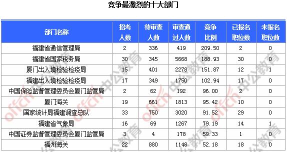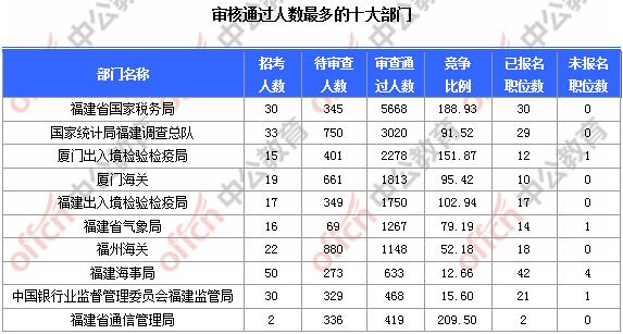 截止到7日16時,通過審核人數(shù)前三位的部門依次是:福建省國家稅務(wù)局、國家統(tǒng)計局福建調(diào)查總隊、廈門出入境檢驗檢疫局,三部門通過審核總?cè)藬?shù)達10966人,占通過審核總?cè)藬?shù)的56.54%。